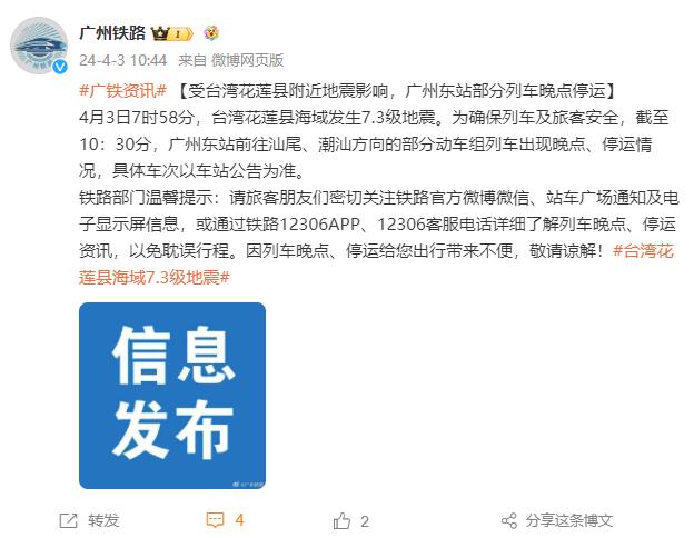 中新網(wǎng)4月3日電 據(jù)中國鐵路廣州局集團(tuán)有限公司官方微博消息,4月3日7時(shí)58分,臺(tái)灣花蓮縣海域發(fā)生7.3級地震。為確保列車及旅客安全,截至10:30分,廣州東站前往汕尾、潮汕方向的部分動(dòng)車組列車出現(xiàn)晚點(diǎn)、停運(yùn)情況,具體車次以車站公告為準(zhǔn)。