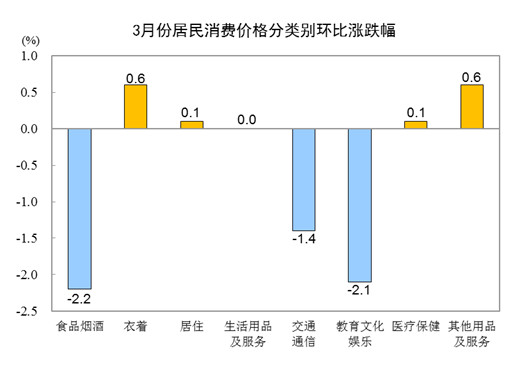 3月份,全國居民消費(fèi)價(jià)格環(huán)比下降1.0%。其中,城市下降1.0%,農(nóng)村下降0.7%;食品價(jià)格下降3.2%,非食品價(jià)格下降0.5%;消費(fèi)品價(jià)格下降0.9%,服務(wù)價(jià)格下降1.1%。