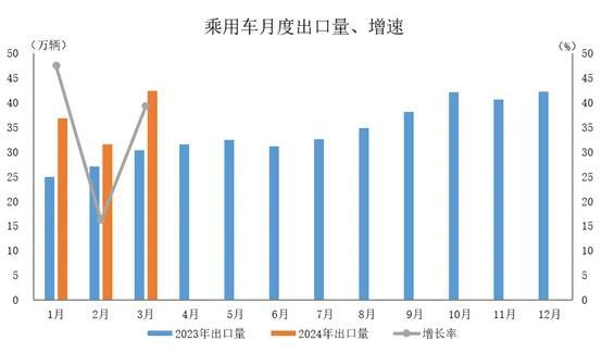 2024年3月,乘用車(chē)出口42.4萬(wàn)輛,環(huán)比增長(zhǎng)34.6%,同比增長(zhǎng)39.3%。