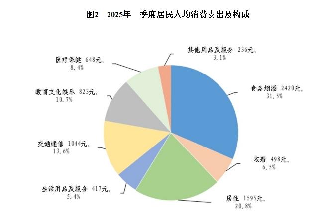 一季度,全國居民人均食品煙酒消費支出2420元,增長2.8%,占人均消費支出的比重為31.5%;人均衣著消費支出498元,增長1.2%,占人均消費支出的比重為6.5%;人均居住消費支出1595元,增長2.1%,占人均消費支出的比重為20.8%;人均生活用品及服務(wù)消費支出417元,增長9.6%,占人均消費支出的比重為5.4%;人均交通通信消費支出1044元,增長10.4%,占人均消費支出的比重為13.6%;人均教育文化娛樂消費支出823元,增長13.9%,占人均消費支出的比重為10.7%;人均醫(yī)療保健消費支出648元,增長3.0%,占人均消費支出的比重為8.4%;人均其他用品及服務(wù)消費支出236元,增長9.9%,占人均消費支出的比重為3.1%。