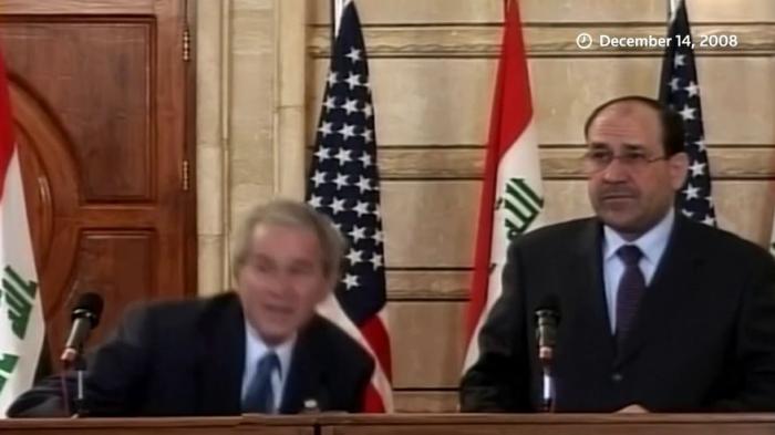 2008年12月,時任美國總統(tǒng)小布什在伊拉克首都巴格達(dá)的新聞發(fā)布會上,被伊拉克記者蒙塔達(dá)爾·扎伊迪扔鞋。圖片來源:路透社視頻截圖