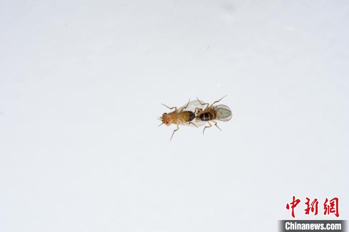 暴露在濃度略微升高的臭氧(100ppb)中15分鐘后的2只雄性果蠅開始嘗試交配?!enjamin Fabian 攝