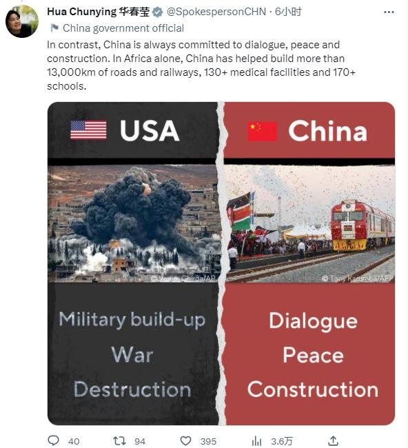華春瑩接著在第二條推文中發(fā)了一張中美對比圖,圖中顯示美國沉迷于軍事建設(shè)、戰(zhàn)爭和破壞?!跋啾戎?,中國始終堅持對話、和平、建設(shè)。僅在非洲,中國就援建了1.3萬多公里公路和鐵路、130多個醫(yī)療設(shè)施、170多所學(xué)校。”華春瑩說。