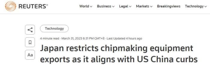 據(jù)路透社報道,日本政府3月31日宣布,將限制23種半導體制造設(shè)備的出口。日本經(jīng)濟產(chǎn)業(yè)省計劃于5月發(fā)布修訂后的省令,并于7月實施。