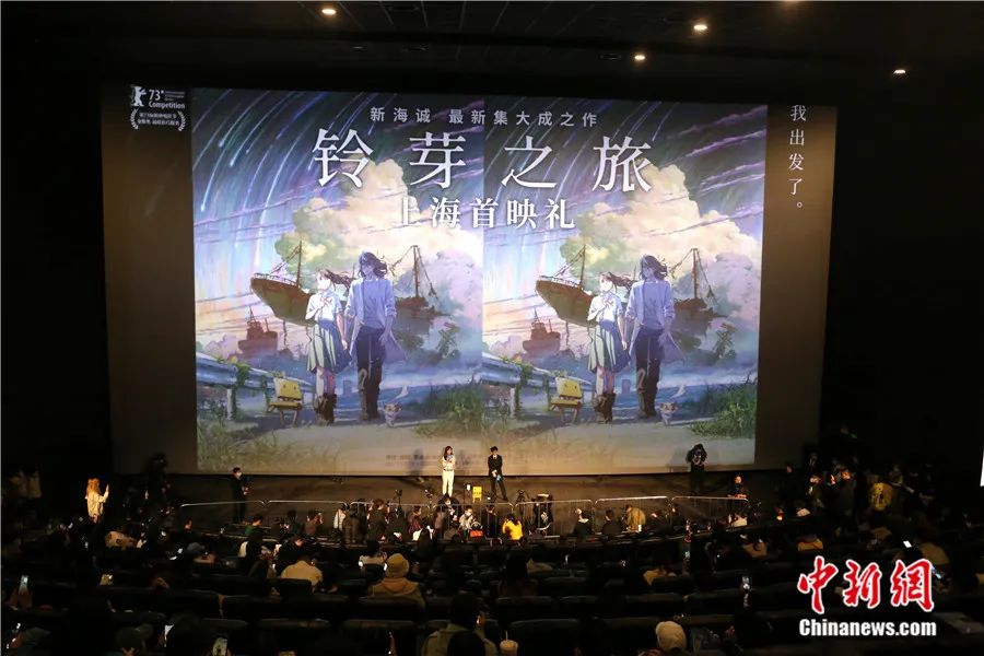 導(dǎo)演新海誠攜最新電影《鈴芽之旅》在上海萬達(dá)影城舉行首映式。陳玉宇 攝