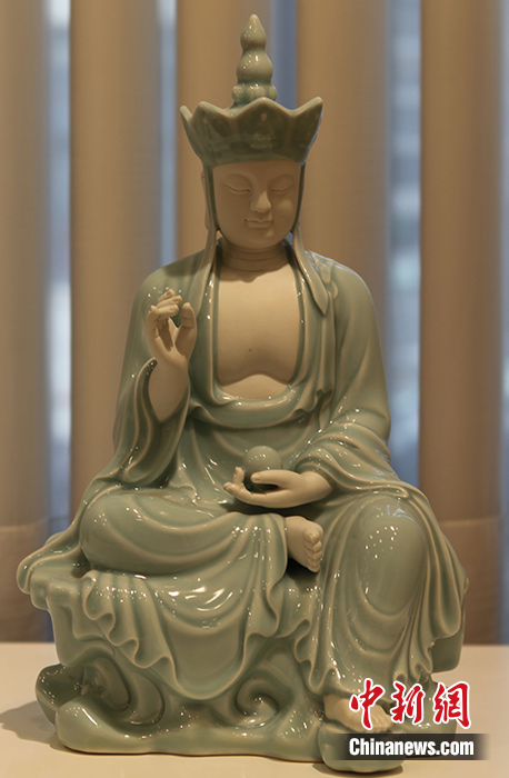 圖為展品《地藏》,造型莊嚴(yán)典雅,寧?kù)o安詳。 中新社記者 德永健 攝