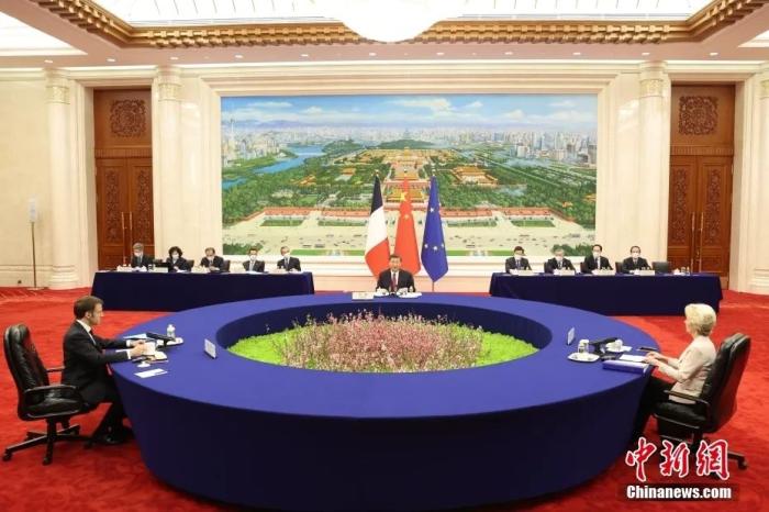4月6日下午,中國(guó)國(guó)家主席習(xí)近平在北京人民大會(huì)堂同法國(guó)總統(tǒng)馬克龍、歐盟委員會(huì)主席馮德萊恩舉行中法歐三方會(huì)晤。中新社記者 盛佳鵬 攝