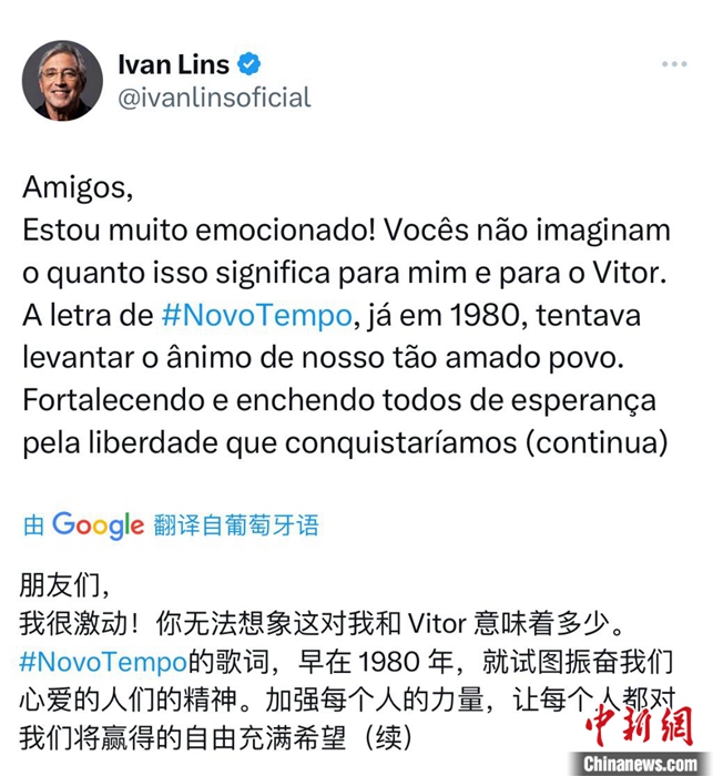 巴西名曲《Novo Tempo》在中巴元首會面時奏響,歌曲作曲、歌者伊萬·林斯在社交媒體上留言。截圖
