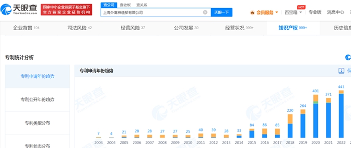 天眼查顯示,近三年,外高橋造船專利申請數(shù)量猛增,2020年為401件,2021年371件,2022年達到441件。這其中有不少專利涉及到大型郵輪,例如“大型郵輪反彈式水封地漏”“大型郵輪醫(yī)院抽風(fēng)管過濾裝置”等。