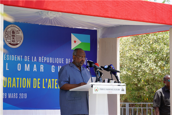 2019年3月28日,吉布提總統(tǒng)蓋萊在魯班工坊啟動儀式上致辭。天津鐵道職業(yè)技術學院供圖