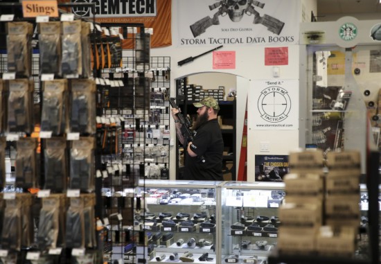 2017年10月4日,在美國拉斯維加斯的“新前線”槍械商店,一名店員為顧客展示槍支?!靶虑熬€”是當?shù)匾?guī)模較大的一家槍械商店,售賣槍支彈藥、槍周邊用品、槍文化衍生品等。新華社記者王迎攝