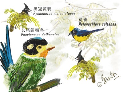 長(zhǎng)尾闊嘴鳥(niǎo)、黑冠黃鵯、冕雀,參賽隊(duì)員用漫畫(huà)展示在弄崗觀鳥(niǎo)的收獲。