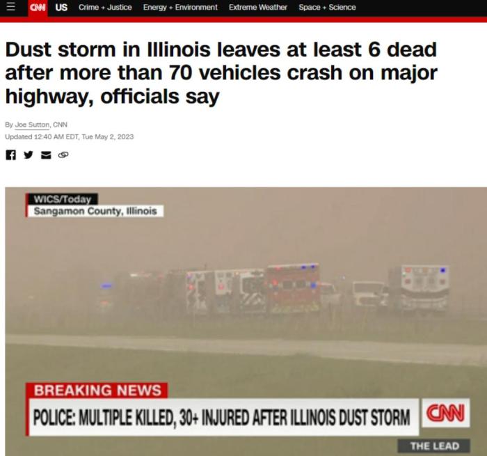 中新網(wǎng)5月2日電 綜合美媒消息,當?shù)貢r間5月1日,由于沙塵暴導(dǎo)致能見度降低,70余輛汽車在美國伊利諾伊州55號州際公路蒙哥馬利縣法默斯維爾鎮(zhèn)附近路段相撞,事故已造成至少6人死亡,37人受傷入院。