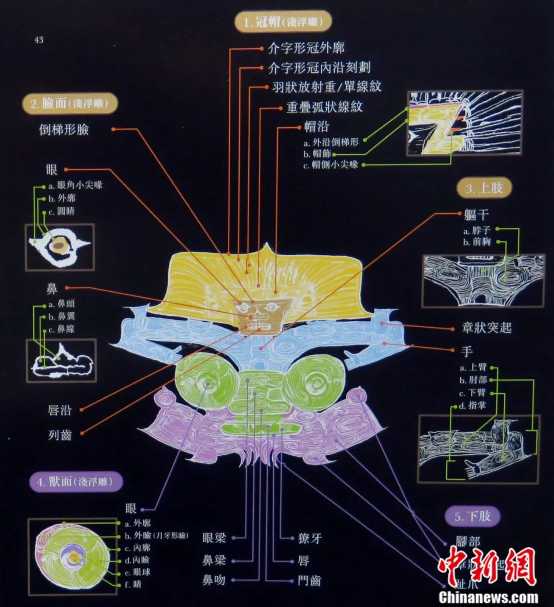 這個圖案的主體為“神人”,面部呈倒梯形,眼睛、鼻子、牙齒都非常寫實?!吧袢恕鳖^上還戴有高聳的羽冠,內(nèi)層刻有連續(xù)卷云紋的帽飾,外層為放射狀羽翎大冠。“神人”的四肢都以陰紋細(xì)刻而成,上肢作抬臂、彎肘狀,五指平張?!吧袢恕钡纳硐率且恢环诘厣系纳瘾F(形似老虎),外框有橢圓形的眼瞼,之間以橋形凸面相連,有鼻梁和鼻翼,闊嘴內(nèi)有尖利的牙齒。
