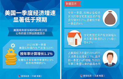近日,美國商務(wù)部經(jīng)濟(jì)分析局?jǐn)?shù)據(jù)顯示,美國2023年一季度GDP年化環(huán)比增長1.1%,大幅低于市場預(yù)期的2%,較去年四季度2.6%的增幅有所回落,已連續(xù)兩個(gè)季度放緩?!度A爾街日報(bào)》網(wǎng)站報(bào)道稱,在通貨膨脹仍然高企、利率不斷上升的情況下,美國第一季度經(jīng)濟(jì)增長下滑,增加了人們對今年晚些時(shí)候可能出現(xiàn)經(jīng)濟(jì)衰退的擔(dān)憂。