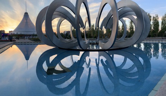 ↑哈薩克斯坦首都阿斯塔納的雕塑和遠處的“可汗之帳”購物中心。