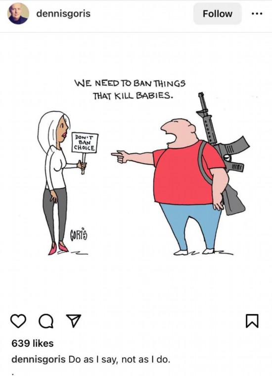 在網(wǎng)友Dennisgoris創(chuàng)作的漫畫中,一名男子指著一名女子說,“我們要禁止殺死嬰兒的政策”,卻無視自己背著的步槍。根據(jù)美國疾控中心等機構數(shù)據(jù),槍支暴力是美國兒童和青少年死亡首要原因。