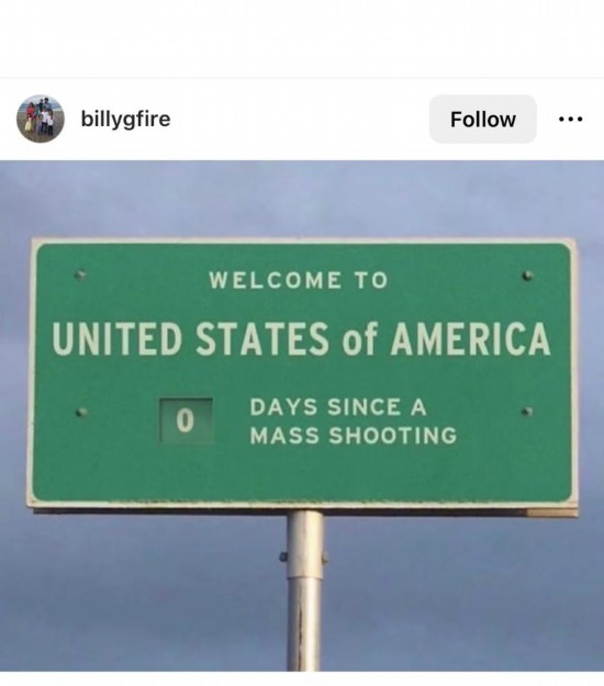 網(wǎng)友Billygfire創(chuàng)作了一塊高速公路廣告牌,上面寫道:“歡迎來到美國,距離上一次大規(guī)模槍擊已經(jīng)過了0天?!?/p>