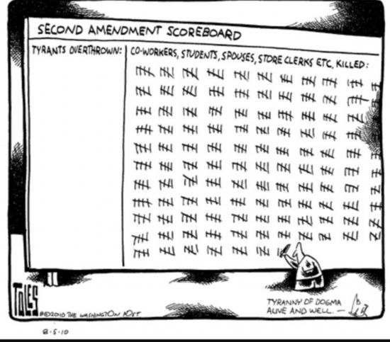 這幅漫畫題為《第二修正案“得分板”》,右邊顯示因為第二修正案死亡的同事、學生、配偶、商店售貨員等各色人等。美國憲法第二修正案是美國公民擁槍的主要法律依據(jù)。
