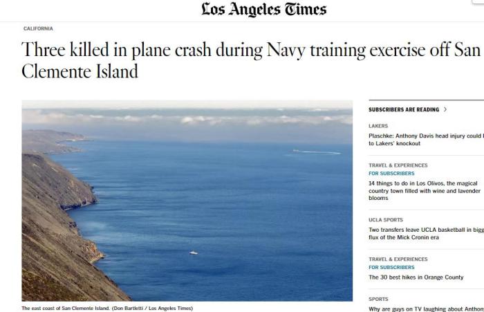 報(bào)道稱,其中一架載有三人的“利爾”噴氣式飛機(jī)從穆古角海軍航空站起飛,后與空中交通管制員失去聯(lián)系。美國海岸警衛(wèi)隊(duì)發(fā)言人李維·里德(Levi Read)隨后證實(shí),這架飛機(jī)于10日上午7時55分左右墜入太平洋。另一架飛機(jī)安全著陸。