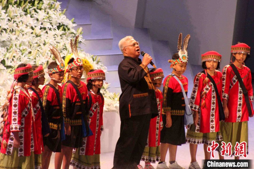 2009年9月,“88水災(zāi)”追悼大會(huì)在高雄市巨蛋舉行,約5000人與會(huì)。圖為臺(tái)灣著名歌手胡德夫帶領(lǐng)九個(gè)孩子出場(chǎng),演唱歌曲悼念逝者,為受災(zāi)民眾祈福。董會(huì)峰 攝
