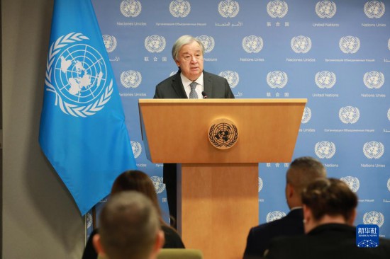 5月17日,在位于紐約的聯(lián)合國總部,聯(lián)合國秘書長古特雷斯在記者會(huì)上講話。新華社記者謝鍔攝