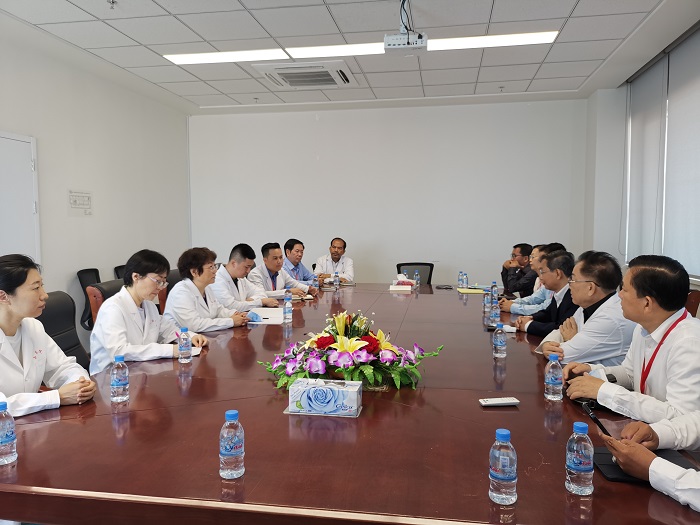 中國(guó)援柬中醫(yī)抗疫醫(yī)療隊(duì)管理組和考斯瑪中柬友誼醫(yī)院院方座談。中國(guó)援柬中醫(yī)抗疫醫(yī)療隊(duì)供圖
