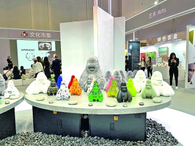 在中東歐展區(qū)的文化市集上,中國與中東歐國家的當(dāng)代藝術(shù)品同臺(tái)展出。其中,最吸引參觀者目光的,當(dāng)屬展臺(tái)正中擺放的一系列形態(tài)各異的中國藝術(shù)家原創(chuàng)IP形象“大衛(wèi)猿”雕塑或毛絨玩具。創(chuàng)作者袁澤銘介紹,本次展出的“大衛(wèi)猩球”項(xiàng)目邀請(qǐng)包括中國以及波黑、匈牙利、羅馬尼亞等中東歐國家在內(nèi)的全球藝術(shù)家為“大衛(wèi)猿”添加各自獨(dú)特的涂裝,體現(xiàn)了不同國家藝術(shù)家之間的文化交流以及藝術(shù)可能性的碰撞。