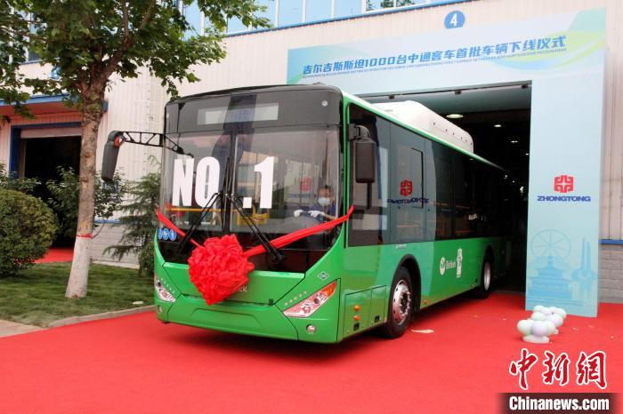 5月20日,吉爾吉斯斯坦1000臺(tái)中通客車首批車輛下線儀式在山東聊城舉行,圖為已經(jīng)下線的10.5米中通天然氣公交車?!≈行律缬浾?孫婷婷 攝
