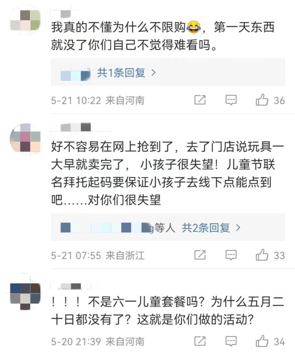 但自5月20日起,在社交平臺(tái)上,就不斷有人反映,已經(jīng)買不到肯德基兒童節(jié)限定玩具??系禄墓俜轿⒉┫拢灿泻芏嗳肆粞?,門店已售罄,能不能補(bǔ)貨。
