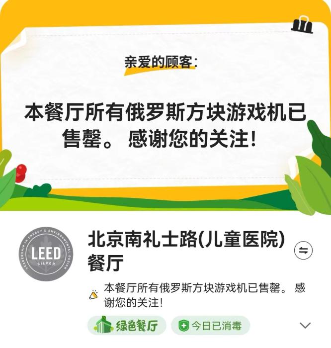 據(jù)麥當(dāng)勞介紹,活動(dòng)期內(nèi)下單購買任意產(chǎn)品,額外加30元即可獲得俄羅斯方塊游戲機(jī)一個(gè),全國限量40萬個(gè)。但當(dāng)日就有不少人表示,已經(jīng)買不到麥當(dāng)勞游戲機(jī)。記者25日登錄麥當(dāng)勞APP,北京多個(gè)門店亦顯示俄羅斯方塊游戲機(jī)已售罄。