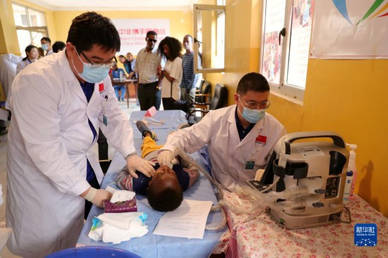5月29日,在埃塞俄比亞首都亞的斯亞貝巴,第24批中國(guó)援埃塞醫(yī)療隊(duì)隊(duì)員為當(dāng)?shù)馗@旱膬和M(jìn)行體檢。新華社記者 汪平 攝