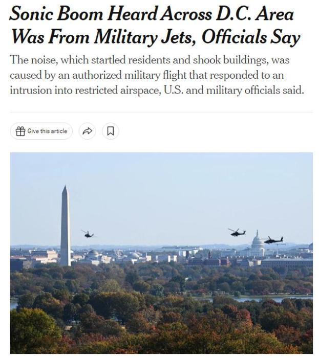 當(dāng)?shù)貢r(shí)間4日,一架塞斯納輕型飛機(jī)疑似闖入華盛頓上空,美軍F-16噴氣式戰(zhàn)斗機(jī)緊急起飛高速追擊,并在美國(guó)首都上空引發(fā)音爆。期間,美軍試圖與塞斯納飛機(jī)上的飛行員建立聯(lián)系。