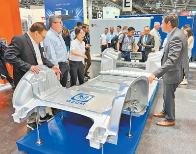 在一家中國(guó)企業(yè)展臺(tái)前,采用一體化壓鑄技術(shù)的新能源車身吸引外國(guó)客商前來咨詢。