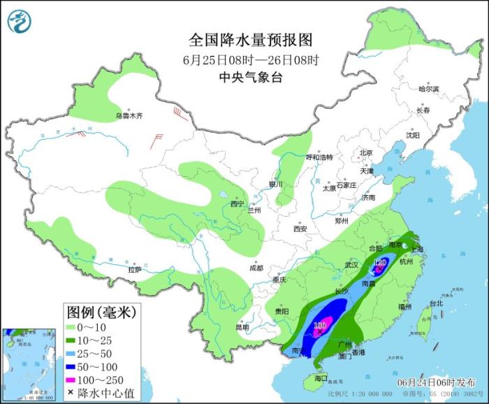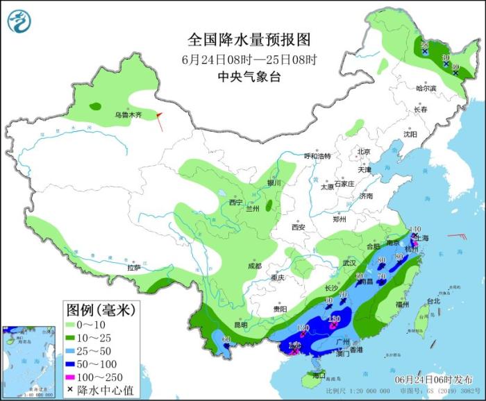 全國降水量預報圖(6月24日08時-25日08時)