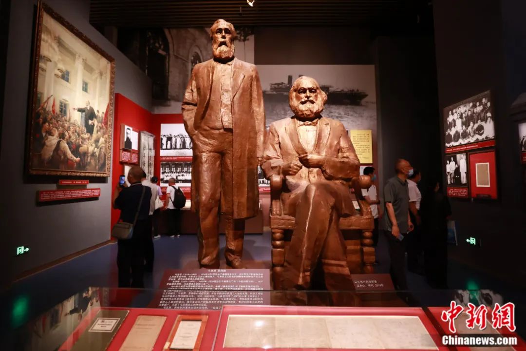 中國共產黨歷史展覽館內的馬克思、恩格斯雕塑。陳曉根 攝