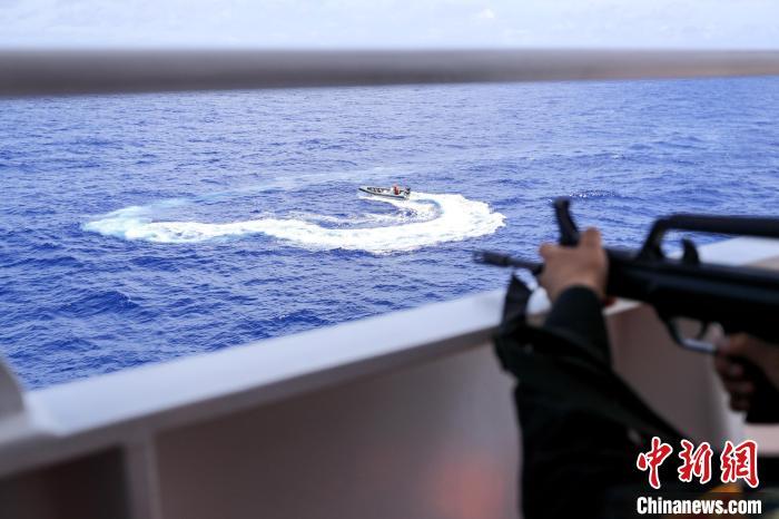 兩發(fā)紅色信號(hào)彈升空,一聲長汽笛響徹海域。指揮所通過16國際頻道用英語向高速接近的“海盜艇”發(fā)出警告:“你迅速離開,否則后果自負(fù)。”隨船取證人員全程照相、錄像取證。