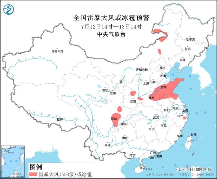 中新網(wǎng)7月12日電 據(jù)中央氣象臺(tái)網(wǎng)站消息,中央氣象臺(tái)7月12日10時(shí)繼續(xù)發(fā)布強(qiáng)對(duì)流天氣藍(lán)色預(yù)警:預(yù)計(jì)7月12日14時(shí)至13日14時(shí),內(nèi)蒙古中東部、陜西中部、山東大部、河南東部、安徽北部、江蘇北部、四川盆地中西部等地的部分地區(qū)將有8-10級(jí)雷暴大風(fēng)或冰雹天氣;內(nèi)蒙古中東部、青海東部、甘肅東部和南部、陜西中南部、山西中北部、河北南部、山東、河南中北部、安徽北部、江蘇北部、四川盆地西部、云南西南部等地的部分地區(qū)將有短時(shí)強(qiáng)降水天氣,小時(shí)雨量30-50毫米,局地可達(dá)60毫米以上。