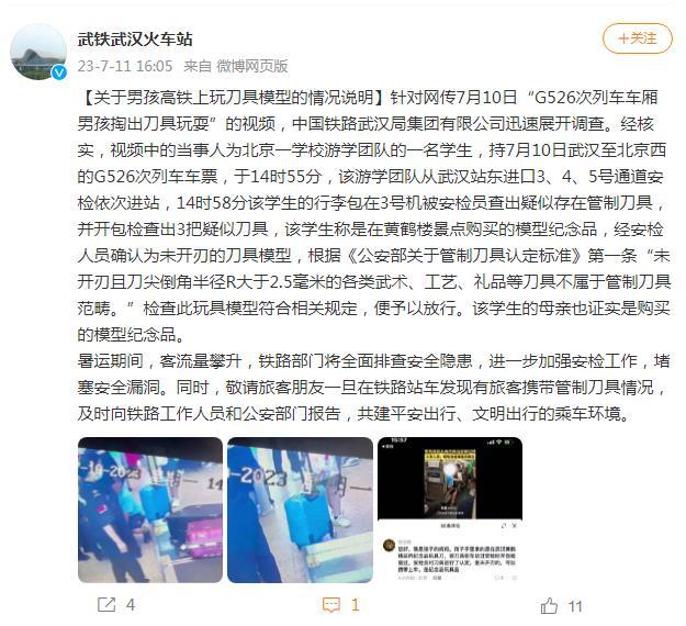 經(jīng)核實,視頻中的當事人為北京一學校游學團隊的一名學生,持7月10日武漢至北京西的G526次列車車票,于14時55分,該游學團隊從武漢站東進口3、4、5號通道安檢依次進站,14時58分該學生的行李包在3號機被安檢員查出疑似存在管制刀具,并開包檢查出3把疑似刀具,該學生稱是在黃鶴樓景點購買的模型紀念品,經(jīng)安檢人員確認為未開刃的刀具模型,根據(jù)《公安部關(guān)于管制刀具認定標準》第一條“未開刃且刀尖倒角半徑R大于2.5毫米的各類武術(shù)、工藝、禮品等刀具不屬于管制刀具范疇?!睓z查此玩具模型符合相關(guān)規(guī)定,便予以放行。該學生的母親也證實是購買的模型紀念品。
