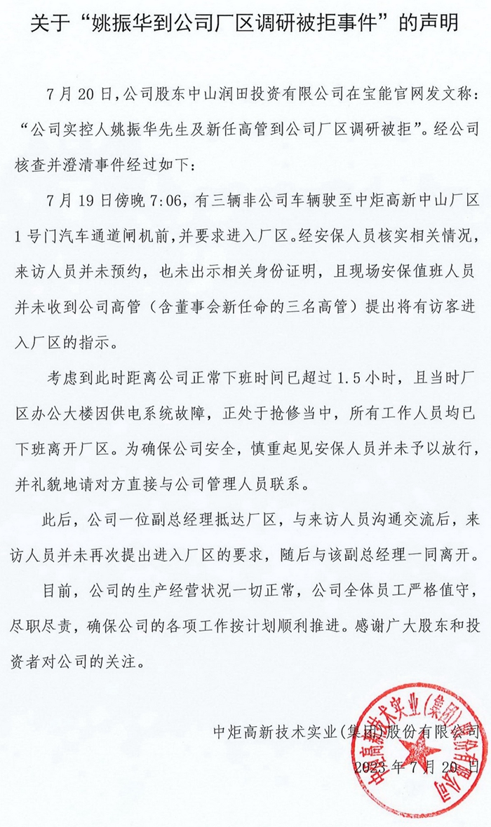近日,“寶能系”股東中山潤田在寶能集團官網(wǎng)發(fā)布聲明稱,寶能集團董事長姚振華得知中炬高新日常管理工作出現(xiàn)重大紕漏的相關情況后,非常擔憂上市公司的生產(chǎn)安全及食品安全問題,趕往中山中炬高新總部,調研生產(chǎn)經(jīng)營情況。未曾想,竟被保安拒絕進入。