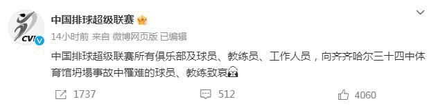 中新網(wǎng)7月25日電 據(jù)中國(guó)排球超級(jí)聯(lián)賽官微25日消息,中國(guó)排球超級(jí)聯(lián)賽所有俱樂(lè)部及球員、教練員、工作人員,向齊齊哈爾三十四中體育館坍塌事故中罹難的球員、教練致哀。