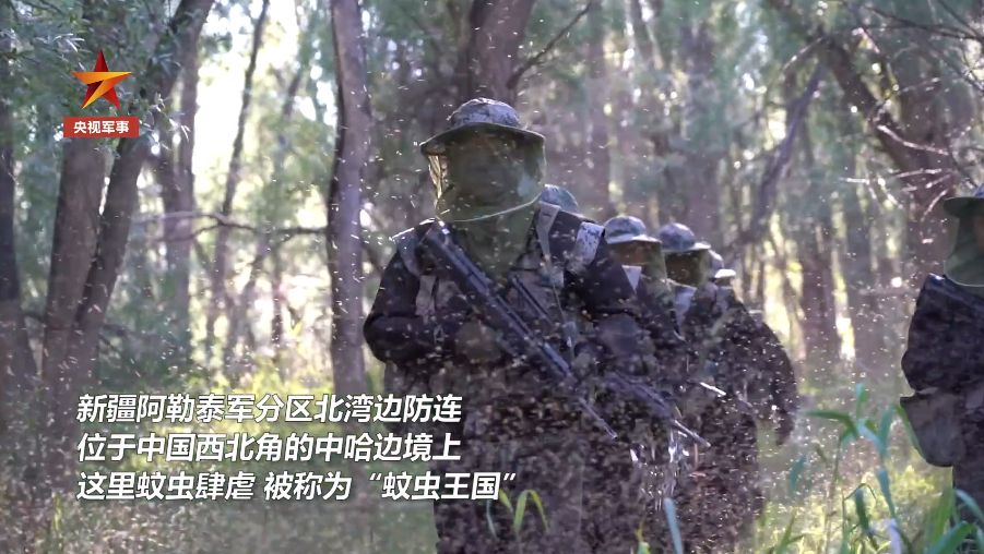 新疆阿勒泰軍分區(qū)北灣邊防戰(zhàn)士穿行蚊子群巡邏。一路上數(shù)以萬計的蚊子、蠓蟲撲面而來。圖片來源:央視軍事視頻截圖