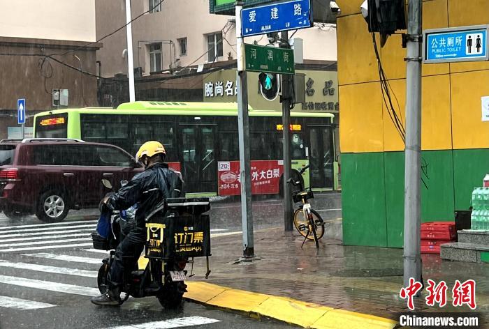 2日上午,哈爾濱街頭,一名外賣員冒雨送餐。趙宇航 攝