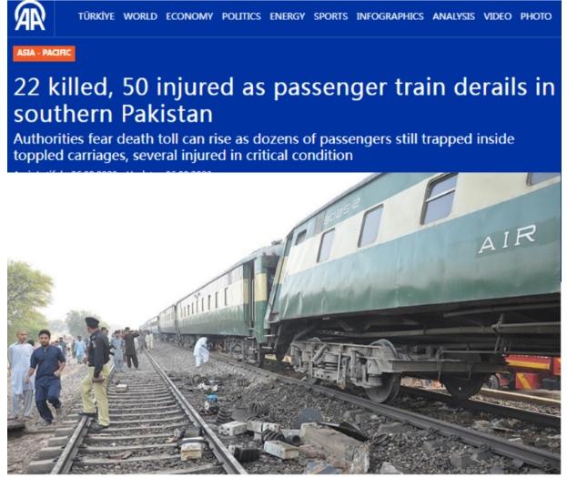 據(jù)報(bào)道,一名巴基斯坦南部信德省官員稱,當(dāng)天,從卡拉奇開(kāi)往哈維連的一列客運(yùn)火車在信德省??藸柕貐^(qū)附近脫軌,有至少10節(jié)車廂沖出軌道。