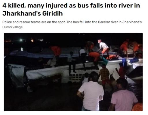 據(jù)報道,當(dāng)?shù)鼐椒Q,當(dāng)晚約20:40,在賈坎德邦(Jharkhand)的吉里迪(Giridih)縣,一輛從蘭契開往吉里迪的大巴車突然撞壞大橋欄桿,隨后墜入河流,橋梁高度約15米,造成至少4人死亡。預(yù)計還有幾人溺水身亡,救援行動正在進行中。