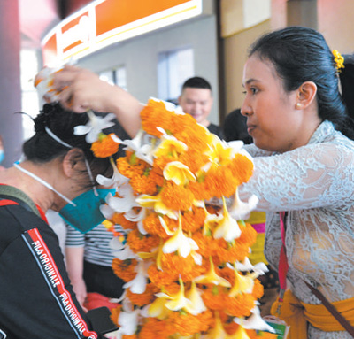 在印度尼西亞巴厘島伍拉萊國際機(jī)場,工作人員為中國游客佩戴迎賓花環(huán)。