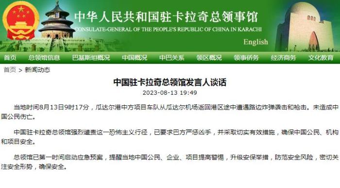 中國駐卡拉奇總領(lǐng)館強(qiáng)烈譴責(zé)這一恐怖主義行徑,已要求巴方嚴(yán)懲兇手,并采取切實(shí)有效措施,確保中國公民、機(jī)構(gòu)和項(xiàng)目安全。