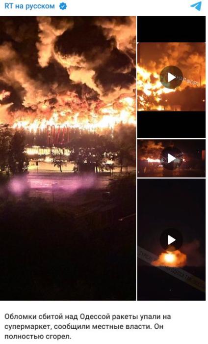 “今日俄羅斯”(RT)稱(chēng),在敖德薩上空被擊落的導(dǎo)彈碎片墜落在一家超市,超市被完全燒毀。此外,一所教育機(jī)構(gòu)的宿舍樓也遭到破壞。