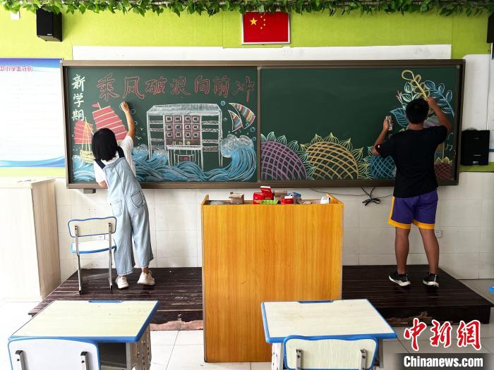 在一間教室里,來(lái)自夏村中學(xué)的教師丁玲正帶著學(xué)生徐俊熙繪制迎接新生的黑板報(bào),有大船、海浪、向日葵等圖案。徐俊熙開(kāi)學(xué)上初二,他對(duì)記者說(shuō):“這個(gè)黑板報(bào)的主題‘乘風(fēng)破浪向前沖’,是為了激勵(lì)同學(xué)們要堅(jiān)強(qiáng)起來(lái),不畏困難,積極向上。”