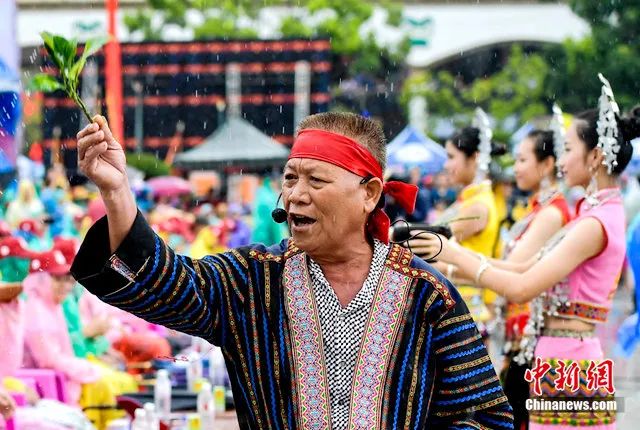 資料圖:黎族長(zhǎng)老帶著“七仙女”向觀眾潑灑“圣水”送祝福。駱云飛 攝